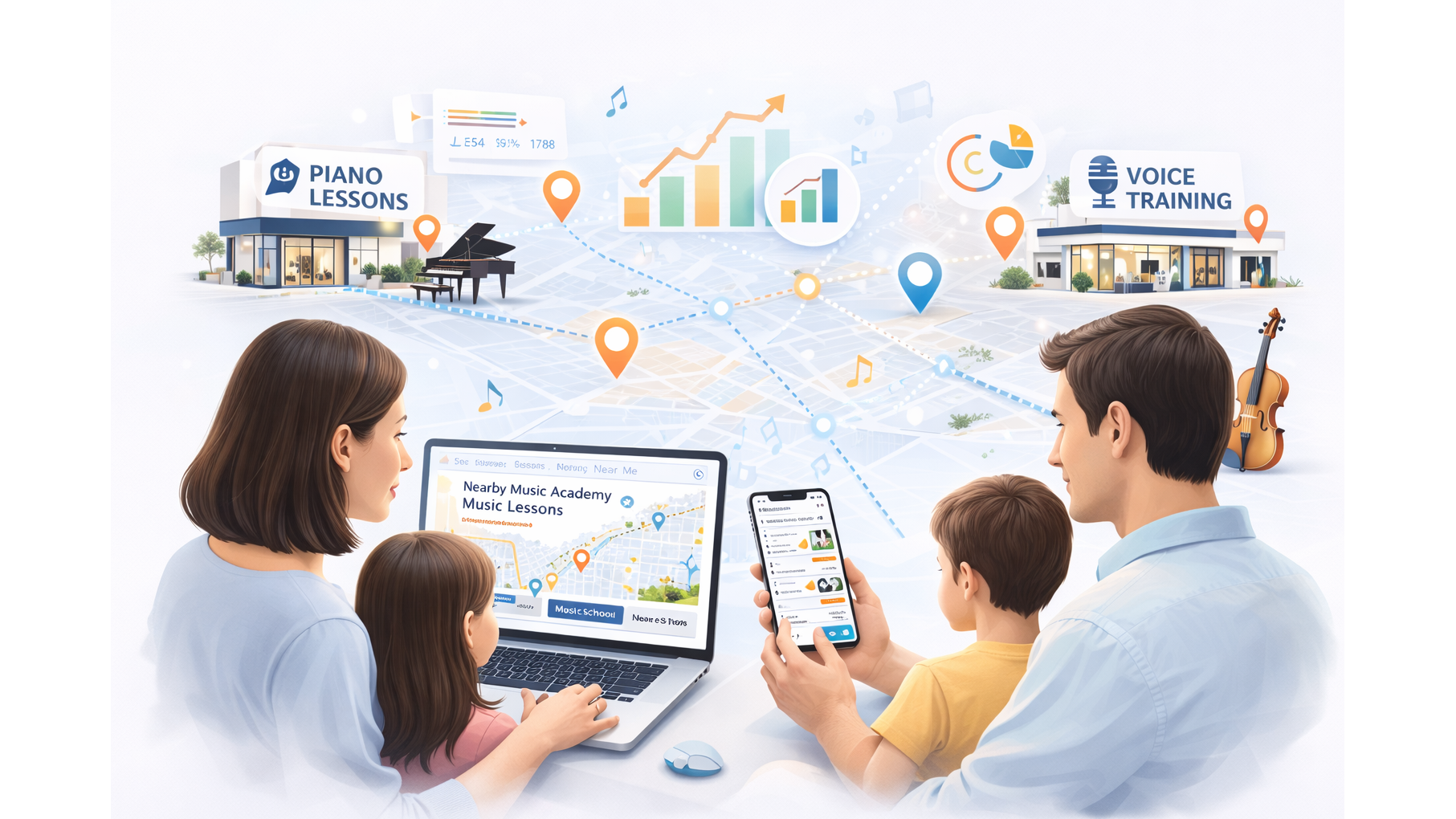 Multi-Location Local SEO – This feature was included because To rank each music school location in local searches for lessons and classes.. This is great news for the consumer as Parents and students can easily find nearby music lessons..