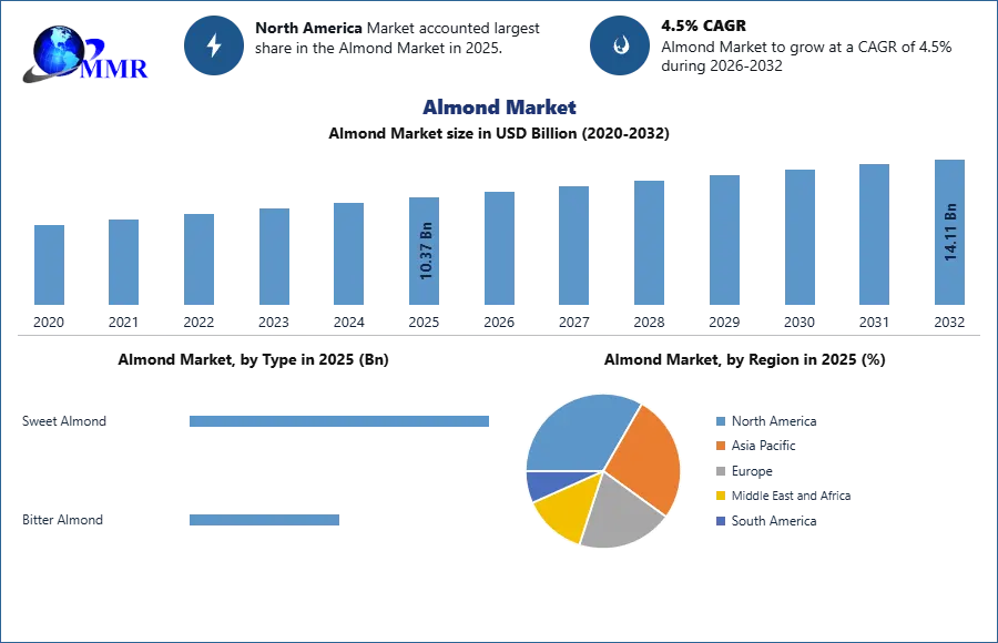 ROCKVILLE , MD, UNITED STATES, April 13, 2026 /EINPresswire.com/ — Global Almond Market Size and Forecast 2032 confirms robust growth, with the market valued at USD 10.37 Billion in 2025 and projected to reach USD 14.11 Billion by 2032, expanding at a CAGR of 4.5% during 2026–2032.