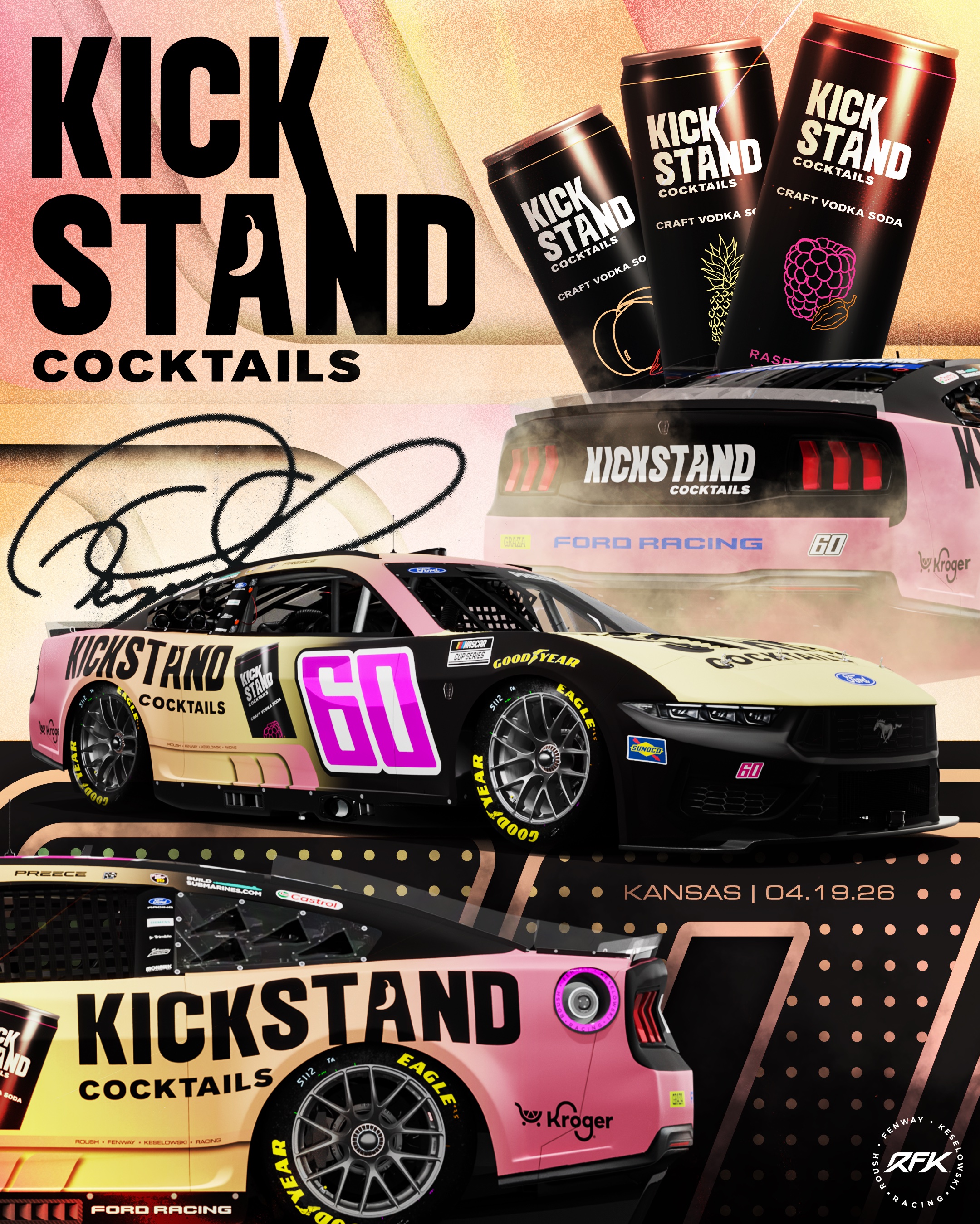 Kickstand Cocktails will debut as a primary partner on Ryan Preece’s No. 60 Ford Mustang at Kansas Speedway on April 19, while also serving as a season-long associate partner on Brad Keselowski’s No. 6 Ford Mustang.